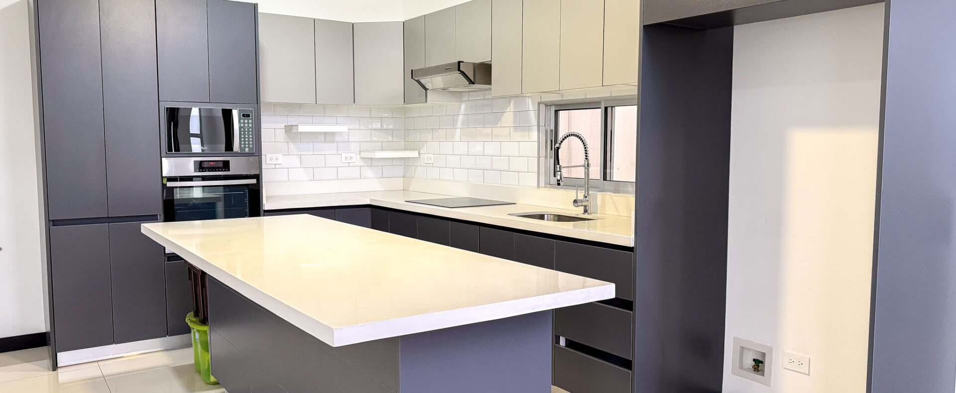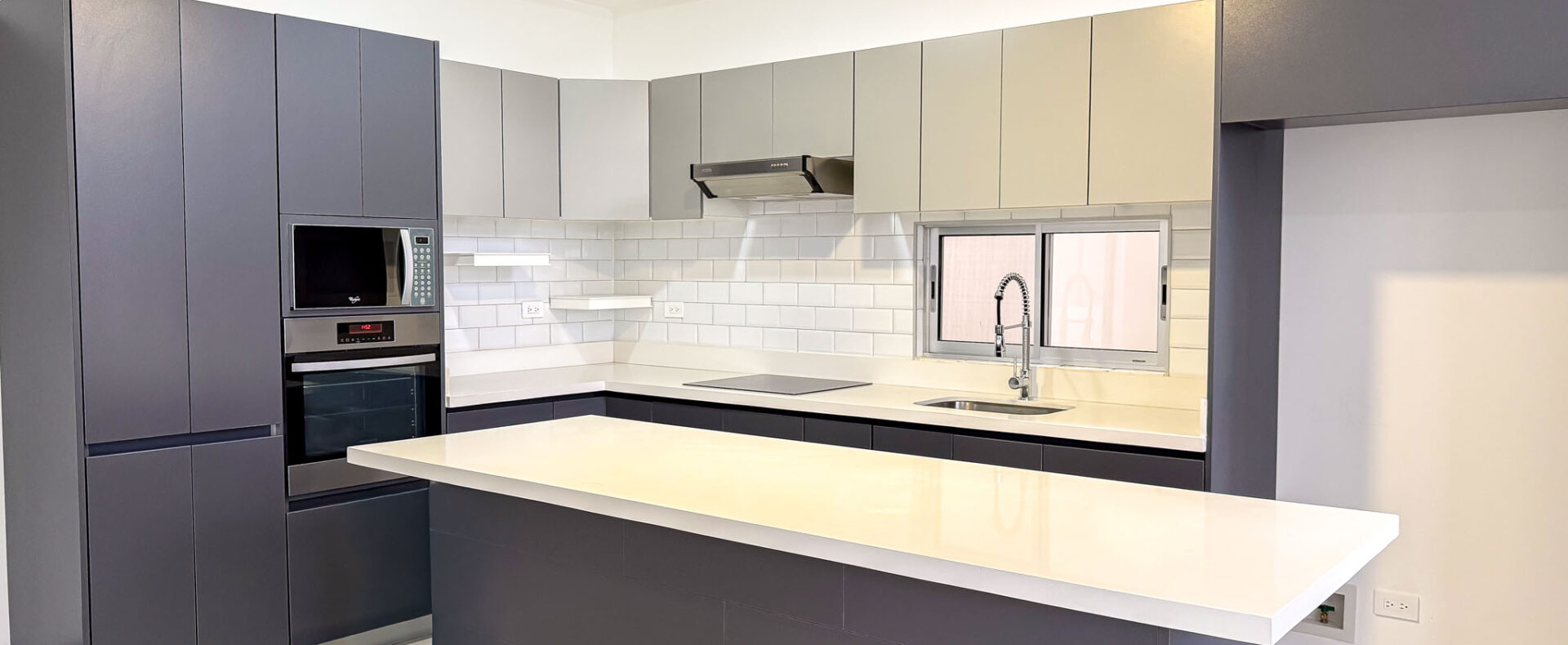 • Cocina moderna con isla central, sobre de cuarzo y muebles en melamina hidrófuga