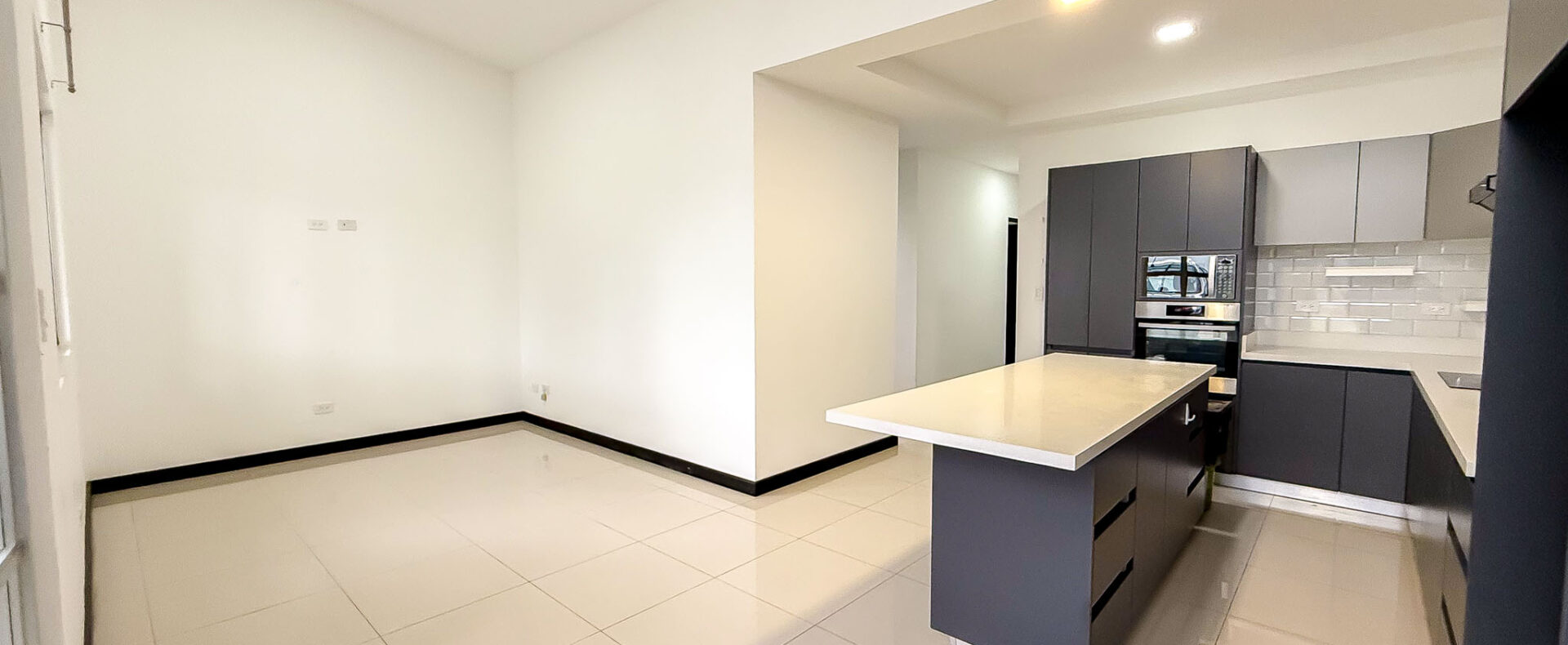 • Modern kitchen with island, quartz countertops, and waterproof melamine cabinetry